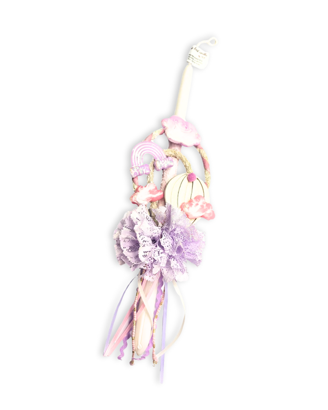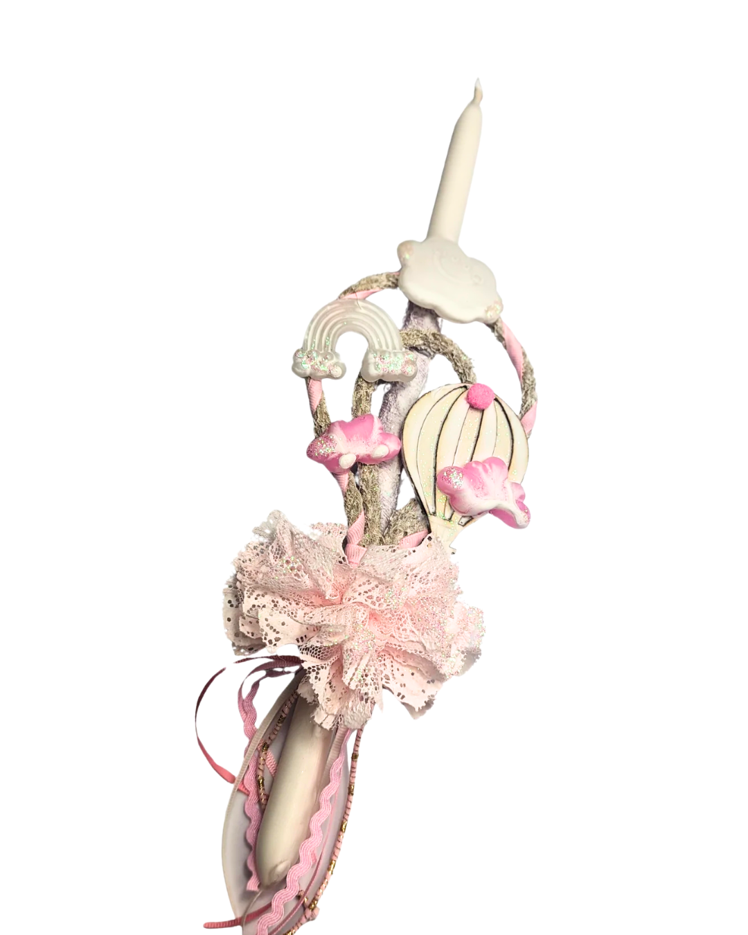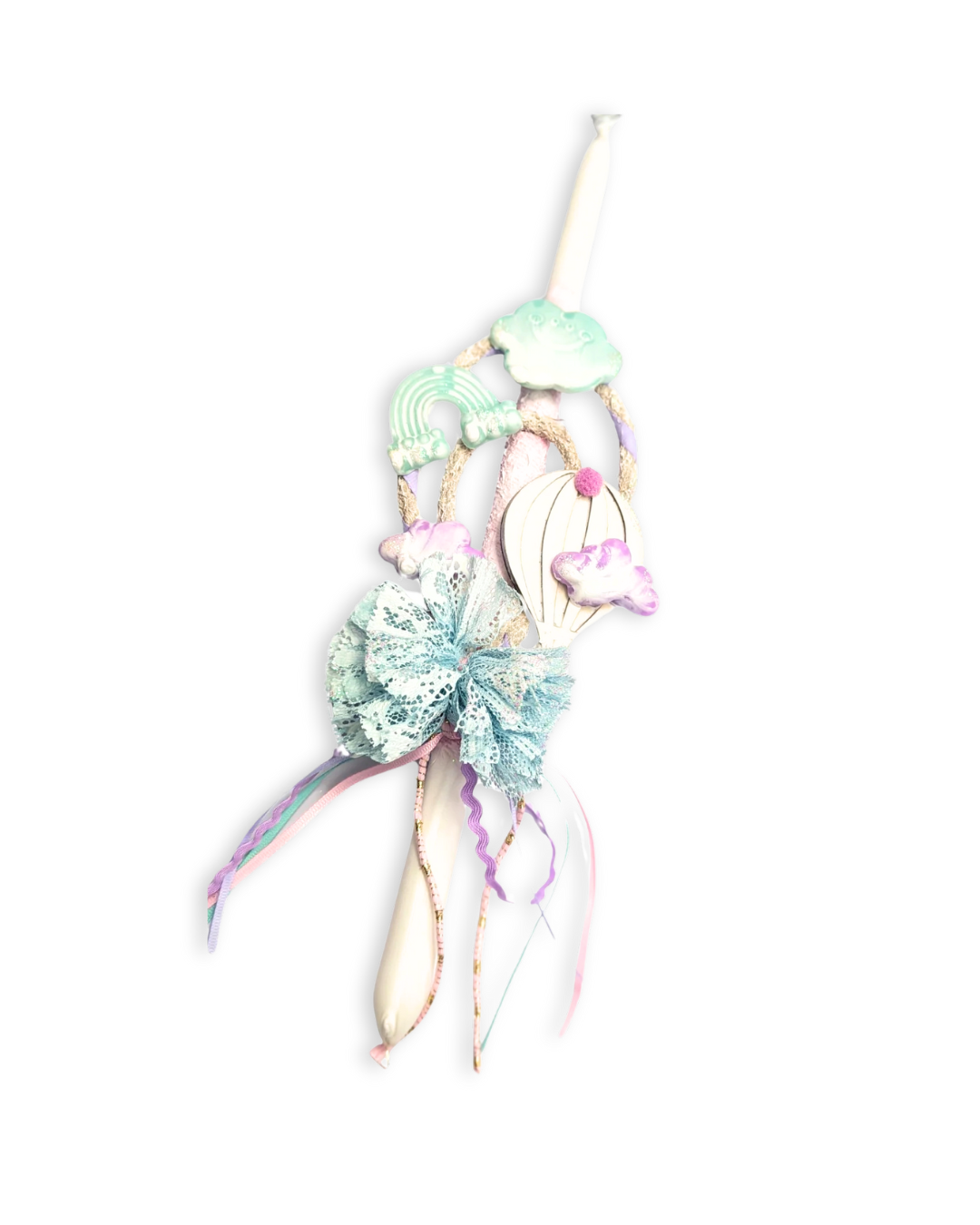 Εντυπωσιακό κερί σε λευκή απόχρωση με όμορφα χρώματα. Διακοσμημένη με κορδέλες, ξύλινο αερόστατο και 3d διακοσμητικά στοιχεία κέρινα συννεφάκια και ουράνιο τόξο. Όλα μαζί συνθέτουν περίτεχνα μια πολύ όμορφη λαμπάδα, ιδανική για μικρά αλλα και μεγάλα παιδιά!